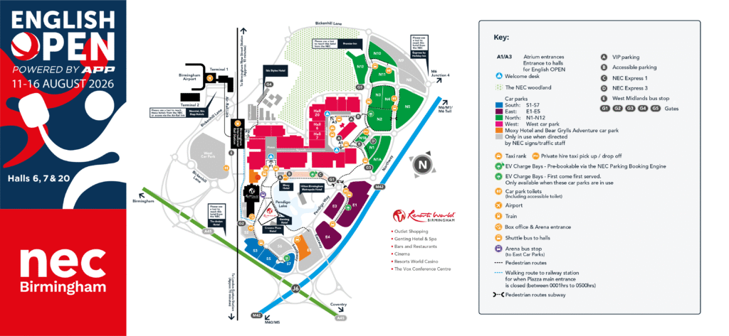We will make sure that every player has a map showing them where to access the tournament if coming by rail, road or air. Once you are inside the NEC, there will be signposting for the Halls we are occupying.