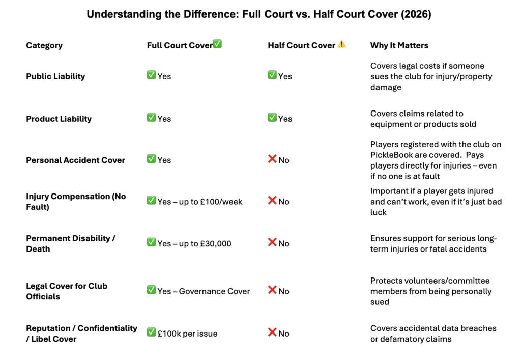 We are currently defining the process for the club insurance. We need to know when your current PLI Club Insurance expires so that we can add you to our policy. You cannot have two policies in place at the same time, so it is important that we only cover you from the expiry date of your current club insurance. If you have taken out either Half Court or Full Court membership and your insurance is due to expire, please email insurance@pickleballengland.org and we will ensure that you have a new insurance certificate. We will be writing to all eligible clubs as soon as the process is finalised.